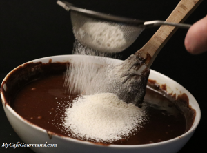 Petit à petit, incorporer la farine avec le bicarbonate de soude et le sel.