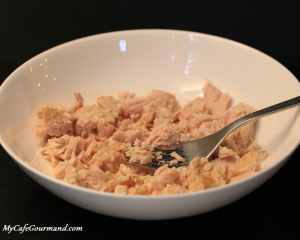 Mixer le thon avec l’œuf et la mayonnaise.