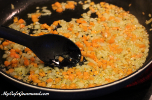 В сковороде разогреть оливковое масло и обжарить в нем лук и морковь на медленном огне. Посолить и поперчить. Снять сковороду с огня.