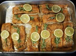 - Сверху на каждый кусочек рыбы положить еще по одному кружочку лимона и веточки розмарина.
