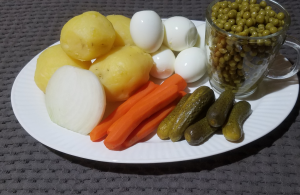- Отварить картошку и морковь. Они должны легко протыкаться ножом, но не быть переваренными, иначе салат будет похож на кашу. Слить воду и охладить.