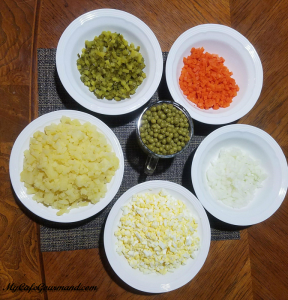 - Порезать картошку, морковь, яйца, лук и огурчики маленькими кубиками.
